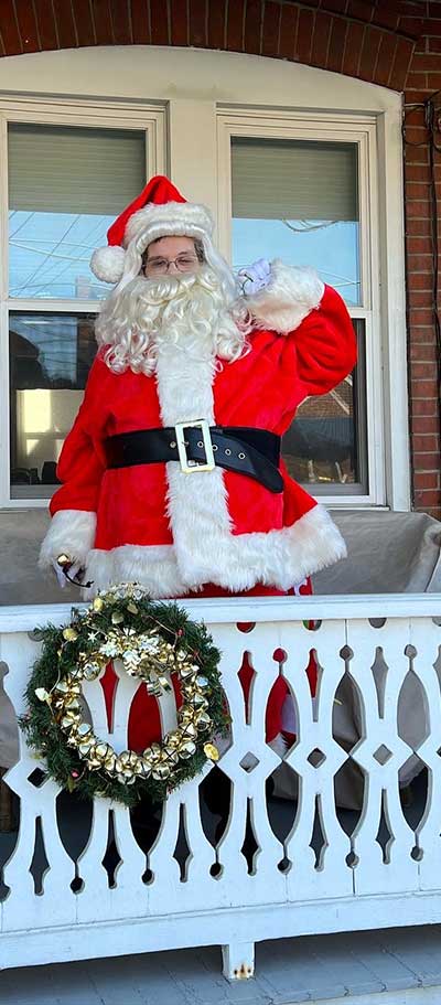 My son Andrew has enjoyed playing Santa for many years. He truly missed this during the pandemic. Our extended family will be gathering for the first time post-pandemic for a picnic in July. We decided to have Christmas in July so Santa Andrew will play his role for everyone once again!This photo is of Andrew on his front porch. He has lived with support in his own home for 12 years. He is living his best life.