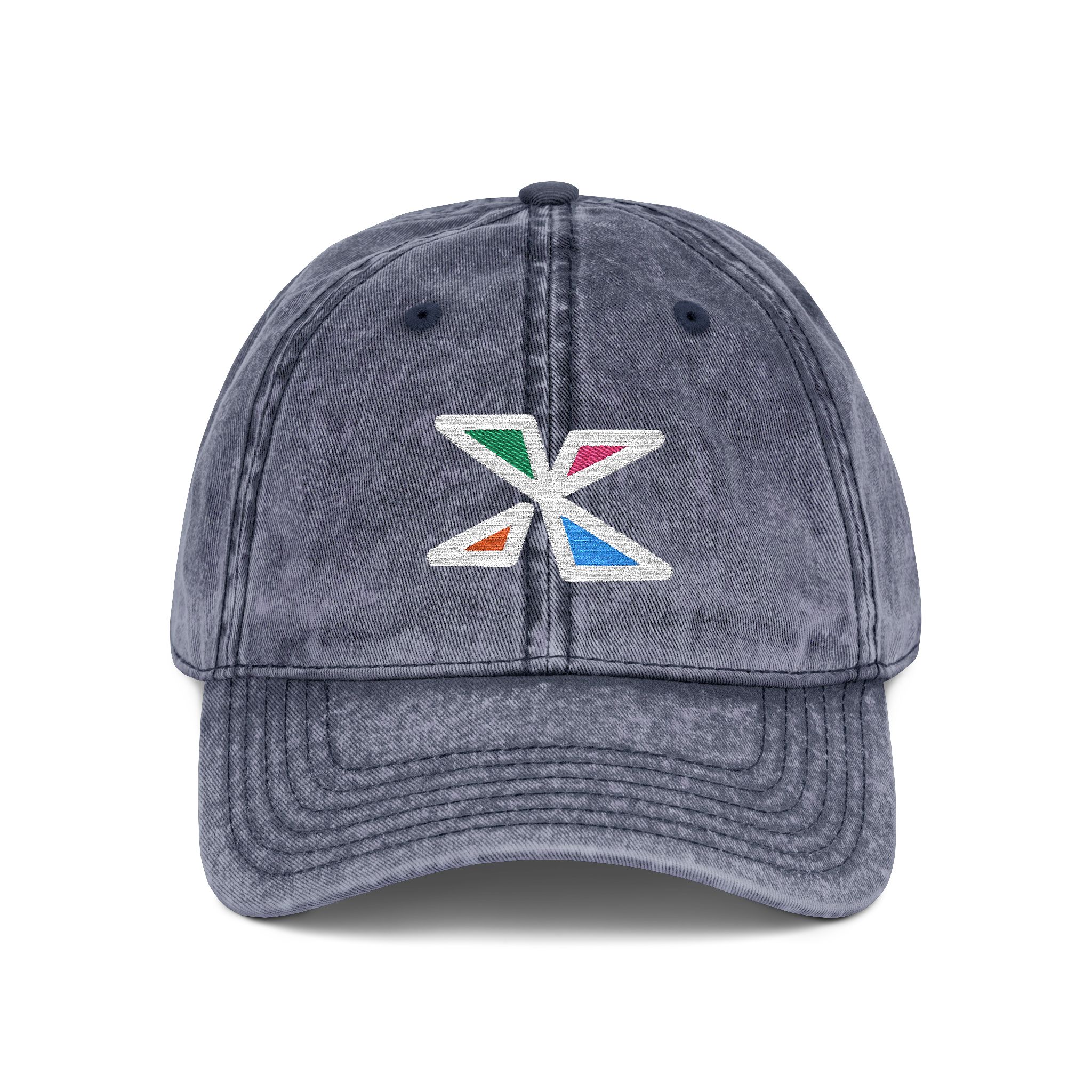 – Embroidered distressed multicolor emblem on front