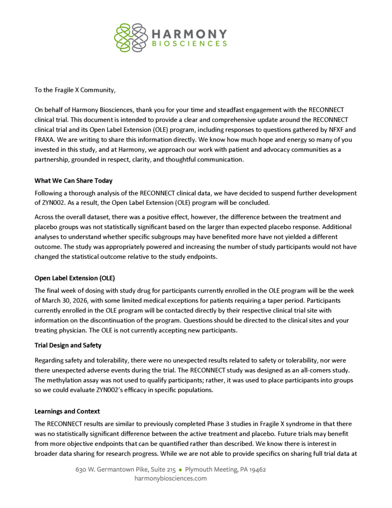 On behalf of Harmony Biosciences, thank you for your time and steadfast engagement with the RECONNECT clinical trial. This document is intended to provide a clear and comprehensive update around the RECONNECT clinical trial and its Open Label Extension (OLE) program, including responses to questions gathered by NFXF and FRAXA. We are writing to share this information directly. We know how much hope and energy so many of you invested in this study, and at Harmony, we approach our work with patient and advocacy communities as a partnership, grounded in respect, clarity, and thoughtful communication.